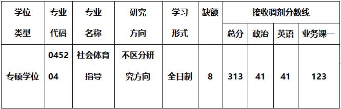 (3)调入专业(社会体育指导)与第一志愿报考专业相同或相近,其中统考科目原则上应相同。接受第一志愿报考体育专业硕士(045204社会体育指导、045201体育教学、045202运动训练、045203竞赛组织4个招生学科领域)和体育学术型硕士(040303体育教育训练学)的考生。