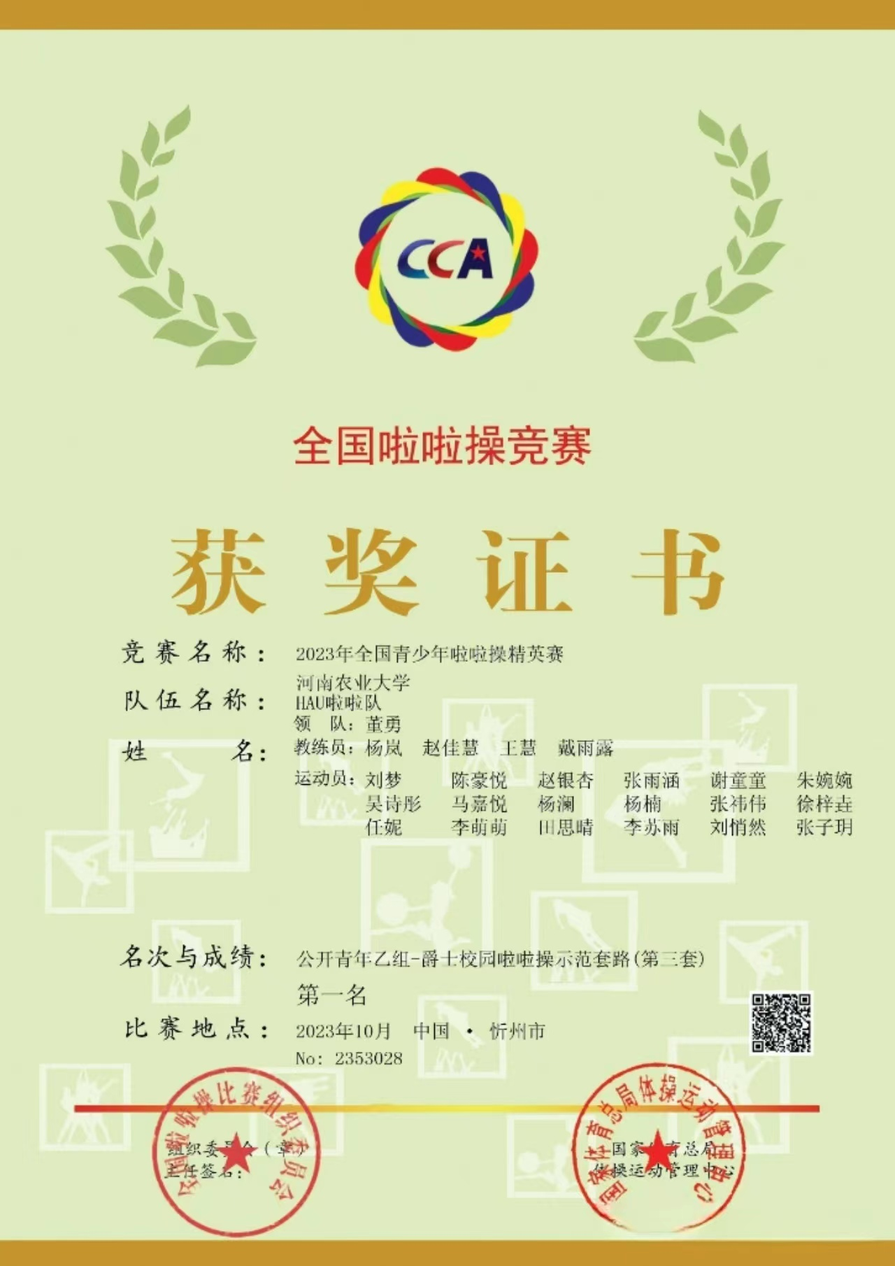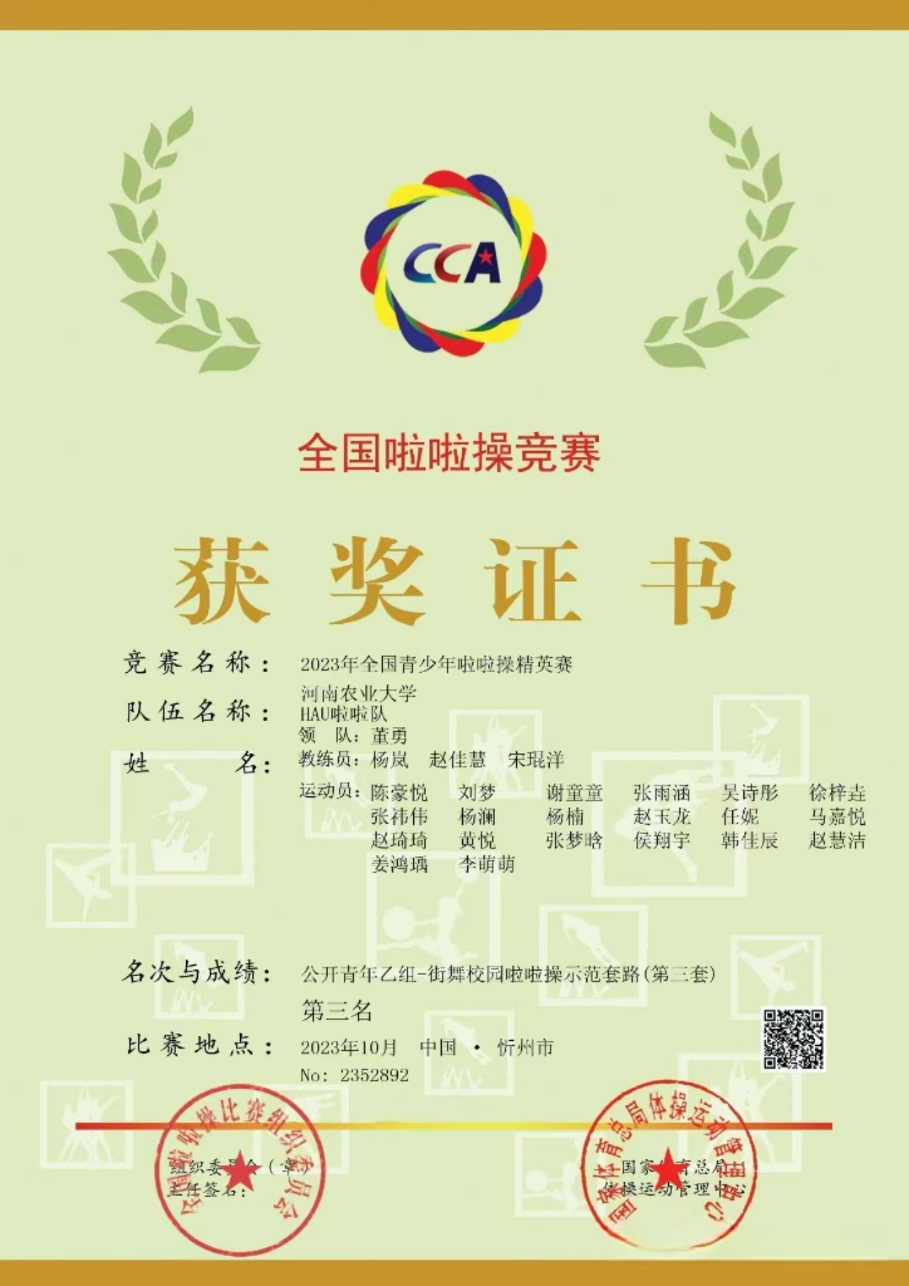 在本次比赛中,嘟嘟成人网 体育艺术系教师杨岚、赵佳慧、王慧、戴雨露担任教练,舞蹈表演专业学生组成的啦啦队在本次比赛中获得了公开青年乙组-爵士校园啦啦操示范套路(第三套)第一名和公开青年乙组-街舞校园啦啦操示范套路(第三套)第三名。