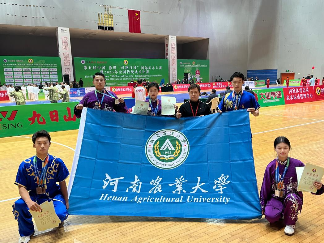 武术代表队报名参赛,共经过12场的激烈角逐,我校武术健儿及留学生在赛场中不畏强手,秉持顽强拼搏、勇攀高峰的意志和信念,一举斩获3金4银9铜的佳绩,樊艺勇老师获优秀教练员称号,樊琳琳、武凌峰两名同学获优秀运动员称号。