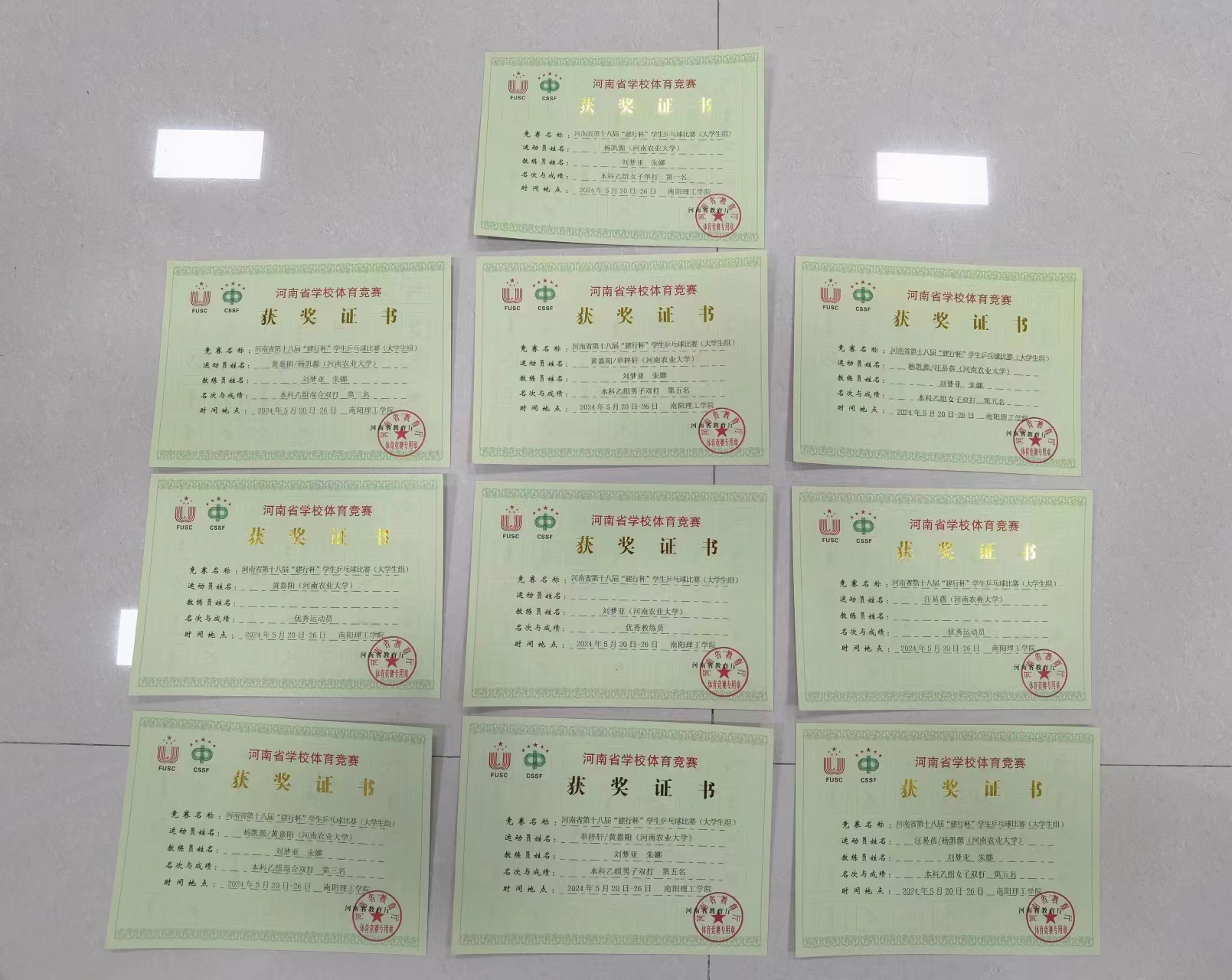 经过一周的激烈角逐,杨凯源获得本科乙组女子单打冠军;黄嘉阳、杨凯源获得本科乙组混合双打第三名;黄嘉阳、单梓轩获得本科乙组男子双打第五名;杨凯源、汪易蓓获得本科乙组女子双打第五名;刘梦亚老师被评为优秀教练员,黄嘉阳、汪易蓓被评为优秀运动员。本次比赛展示了我校学生精湛的球技,以及齐心协力、顽强拼搏、奋勇争先的精神面貌。
