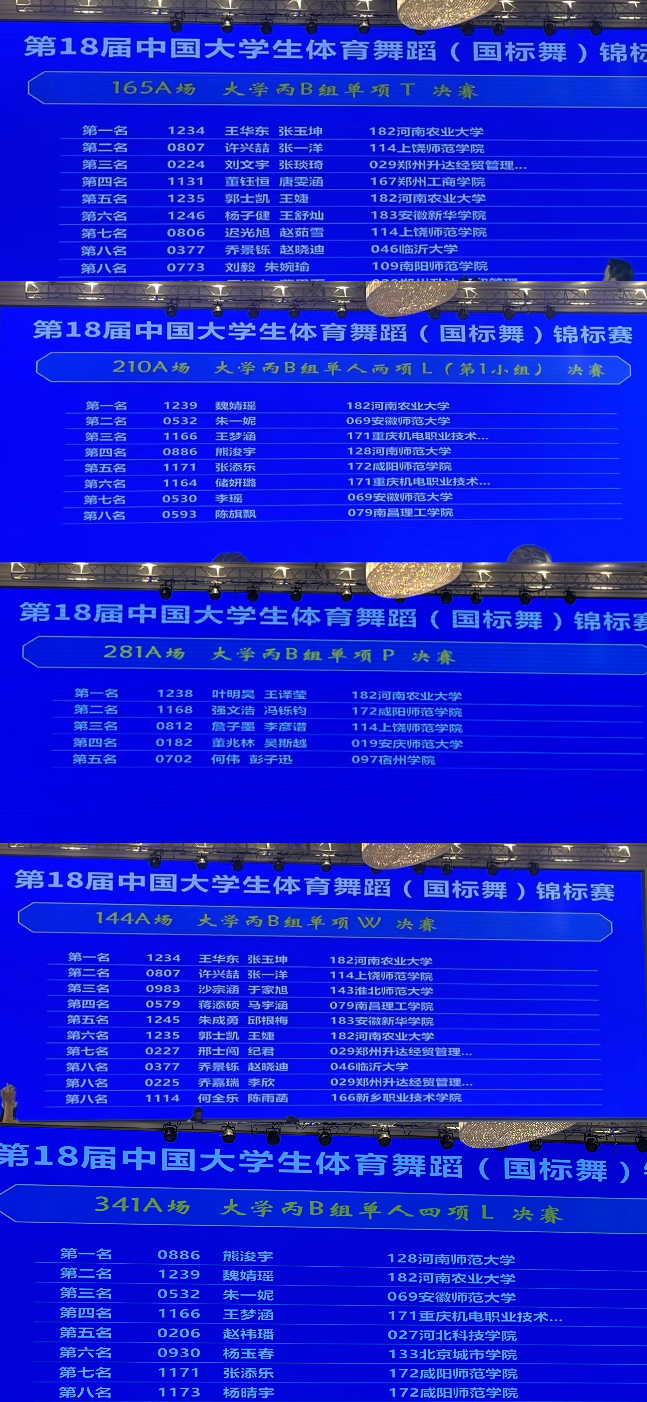 经过四天的激烈角逐,王华东、张玉坤获得大学丙B组单项华尔兹S第一名,单项探戈S第一名;魏婧瑶获得大学丙B组单人两项L第一名,单人四项L第二名;叶明昊、王译莹获得大学丙B组单项斗牛L第一名、大学丙B单项J第八名;魏婧瑶、高淼、刘星语获得大学丙B组艺术表演舞第四名;郭士凯、王婕获得大学丙B组探戈S第五名,大学丙B组华尔兹S第六名;刘煜达、范文婷获得大学丙B组三项S第五名、大学丙B组二项S第八名。