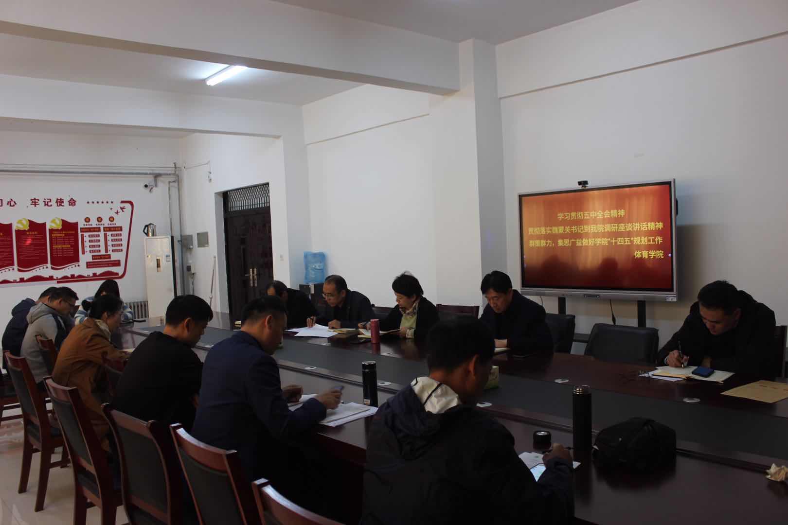 结合学习五中全会精神和魏书记调研座谈讲话精神,吴旭静提出三点要求:一是要紧抓机遇,在更高目标上迎接挑战。要抗牢学院党委主体责任,把握构建新发展格局的重大战略机遇,压实工作责任,有力有序推进学院十三五总结,做好学院十四五发展规划的编制工作。二是凝聚力量,在更高水平上谋划发展。要进一步激发全院师生干事创业的热情,不断提升专业建设水平,提高人才培养质量,为建设文化强国,教育强国,人才强国,体育强国作出更多贡献。三是理清思路,在更高起点上续写辉煌。全面落实立德树人根本任务,将体育资源优势充分融入思想道德教育、文化知识教育、社会实践教育各环节,为全面建设社会主义现代化国家新征程提供源源不竭的人才支持。