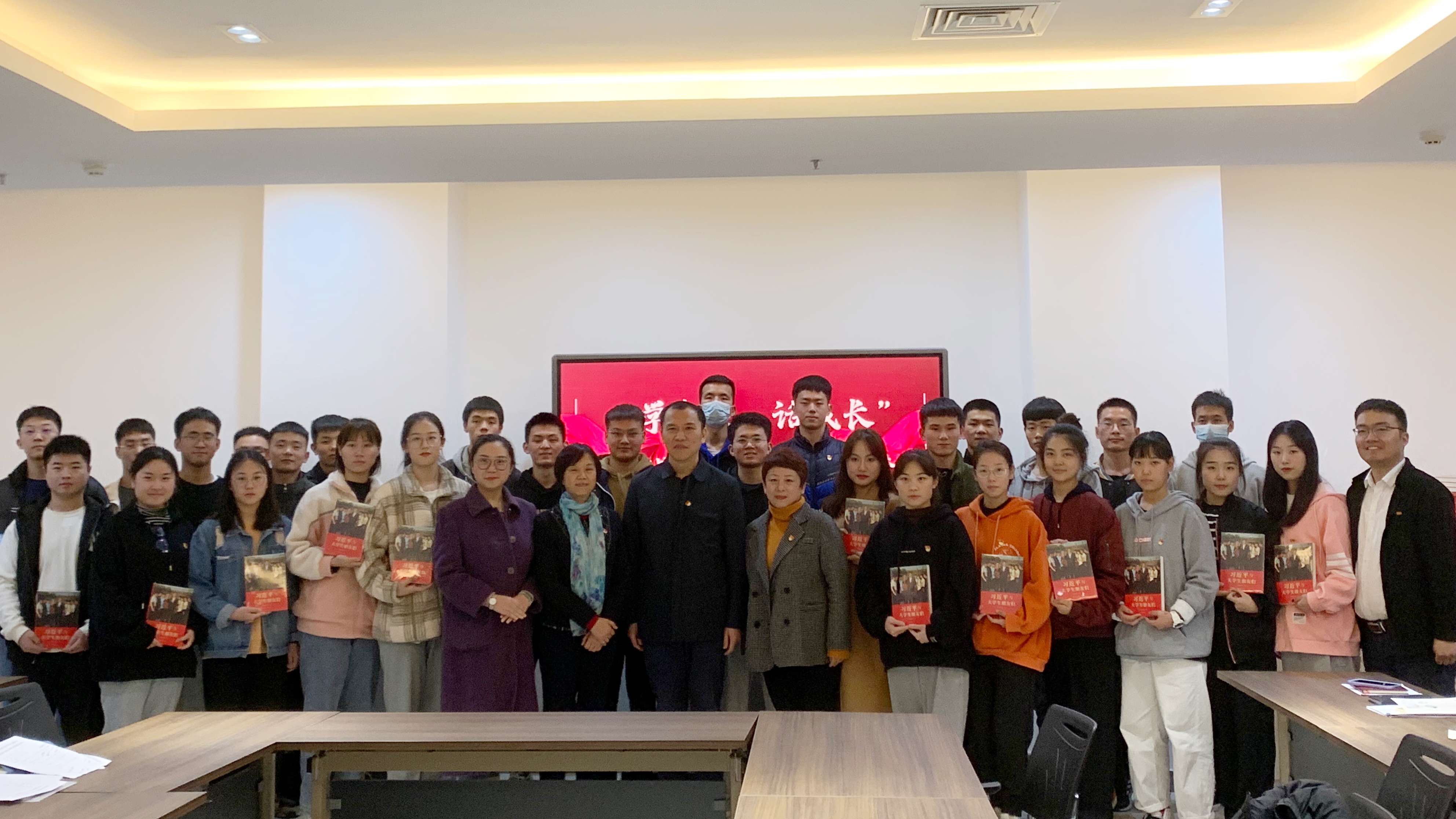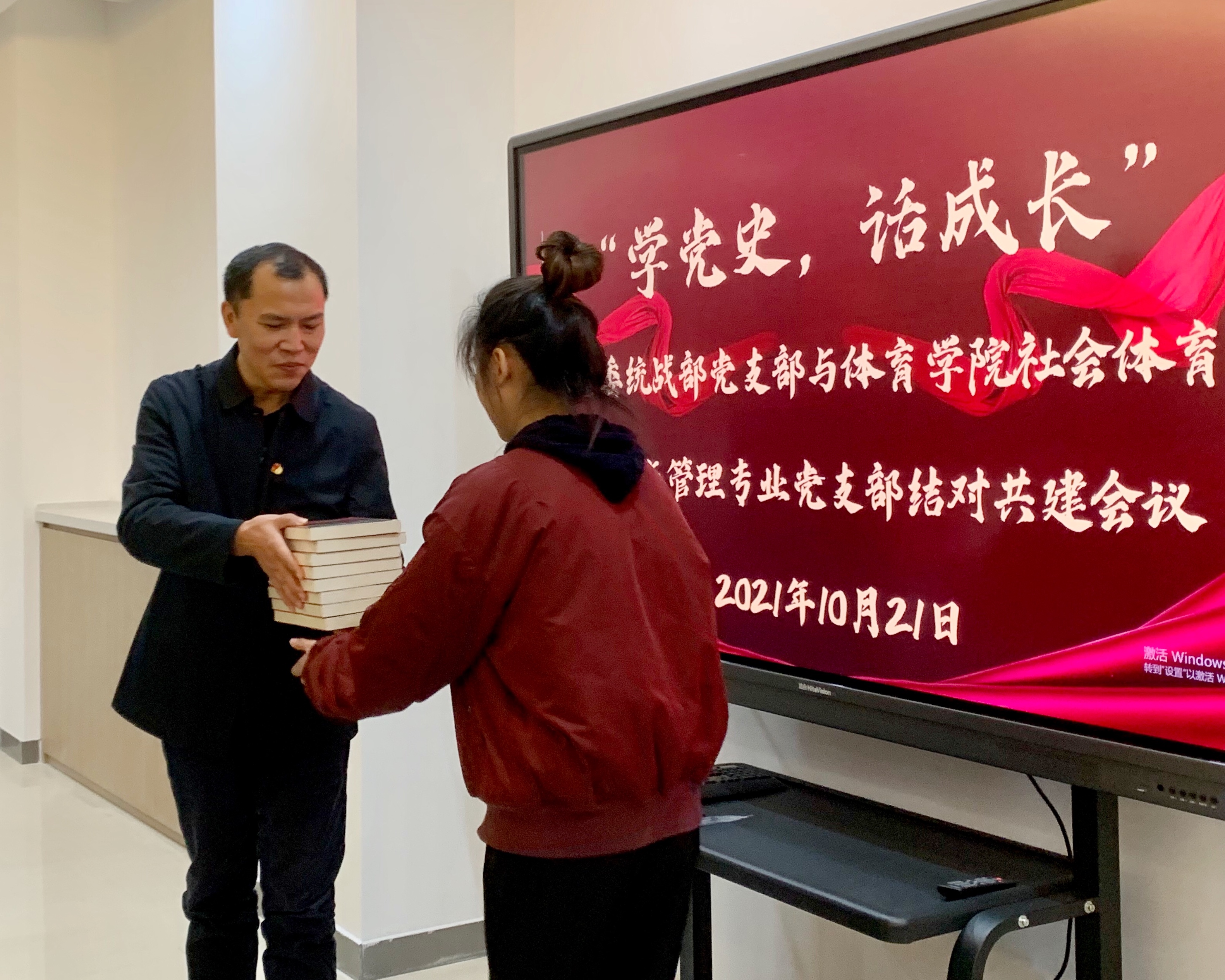 陈书章代表党委统战部党支部向社会体育指导与管理专业党支部全体党员赠送书籍《习近平与大学生朋友们》。