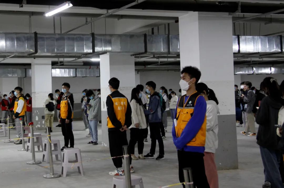 同时,在体育馆外,志愿者们耐心地为同学们指引排队路线。在志愿者们的引导下,师生们保持两米间隔,不扎堆、不聚集、有序流动,保证了核酸检测工作有条不紊地进行。