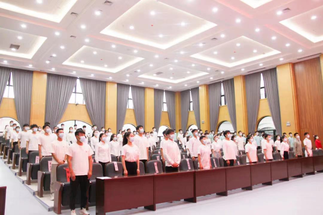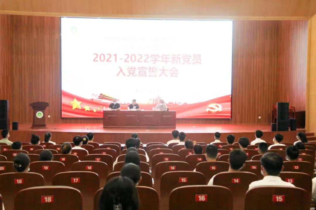 在龙子湖校区图书馆一楼报告厅隆重举行“明德自强庆校百廿,砥砺前行迎二十大”2021—2022学年新党员入党宣誓大会。学院党委书记吴旭静、党委副书记李坤、党委委员、副院长宛新生出席大会,会议由院党委副书记李坤主持。根据疫情防控相关要求,新发展党员和入党积极分子学生代表分别在线上线下参加本次大会。