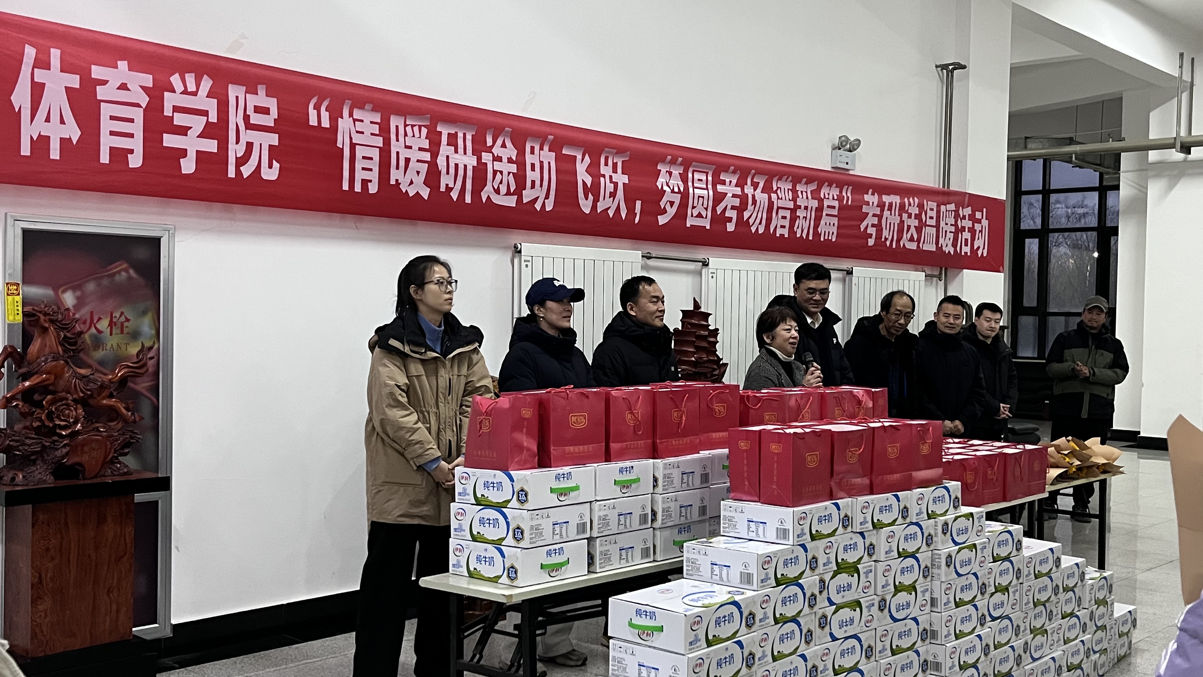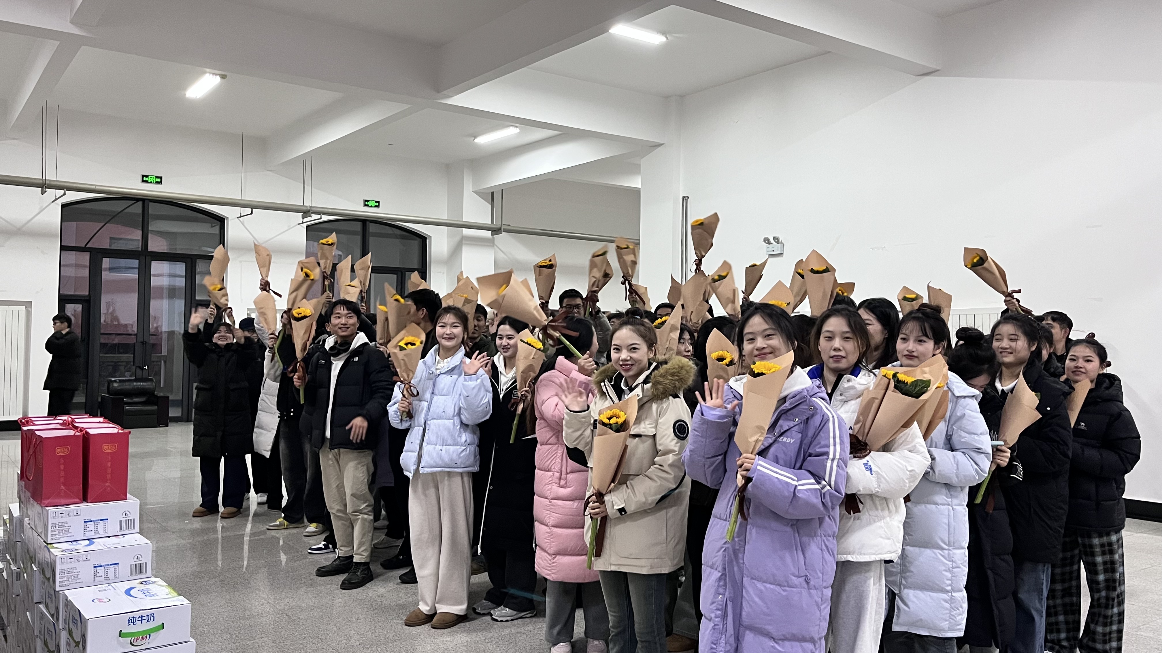 活动伊始,老师们逐个为考研学子送上殷切嘱咐和美好祝愿。吴旭静勉励同学们要调整好作息,保重身体,放平心态,沉着应考。老师们为同学们送上了寓意阳光与希望的向日葵和牛奶等慰问品。那一朵朵金黄灿烂的向日葵,寓意一举夺“葵”,正如同学们心中炽热的希望,相信全体考研学子能在这份温暖的陪伴下乘风破浪,顺利圆梦。